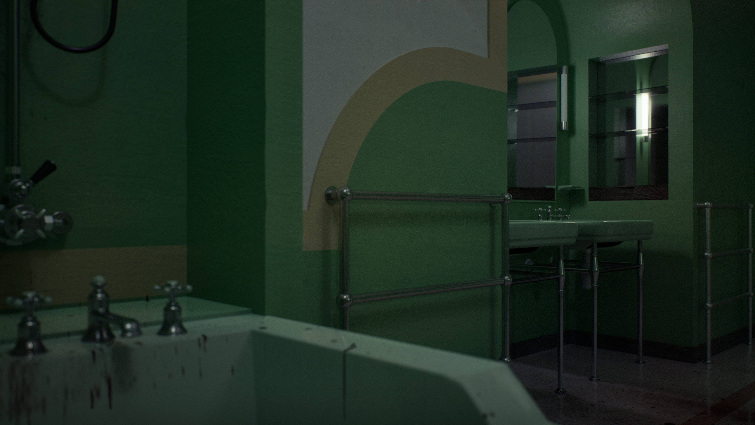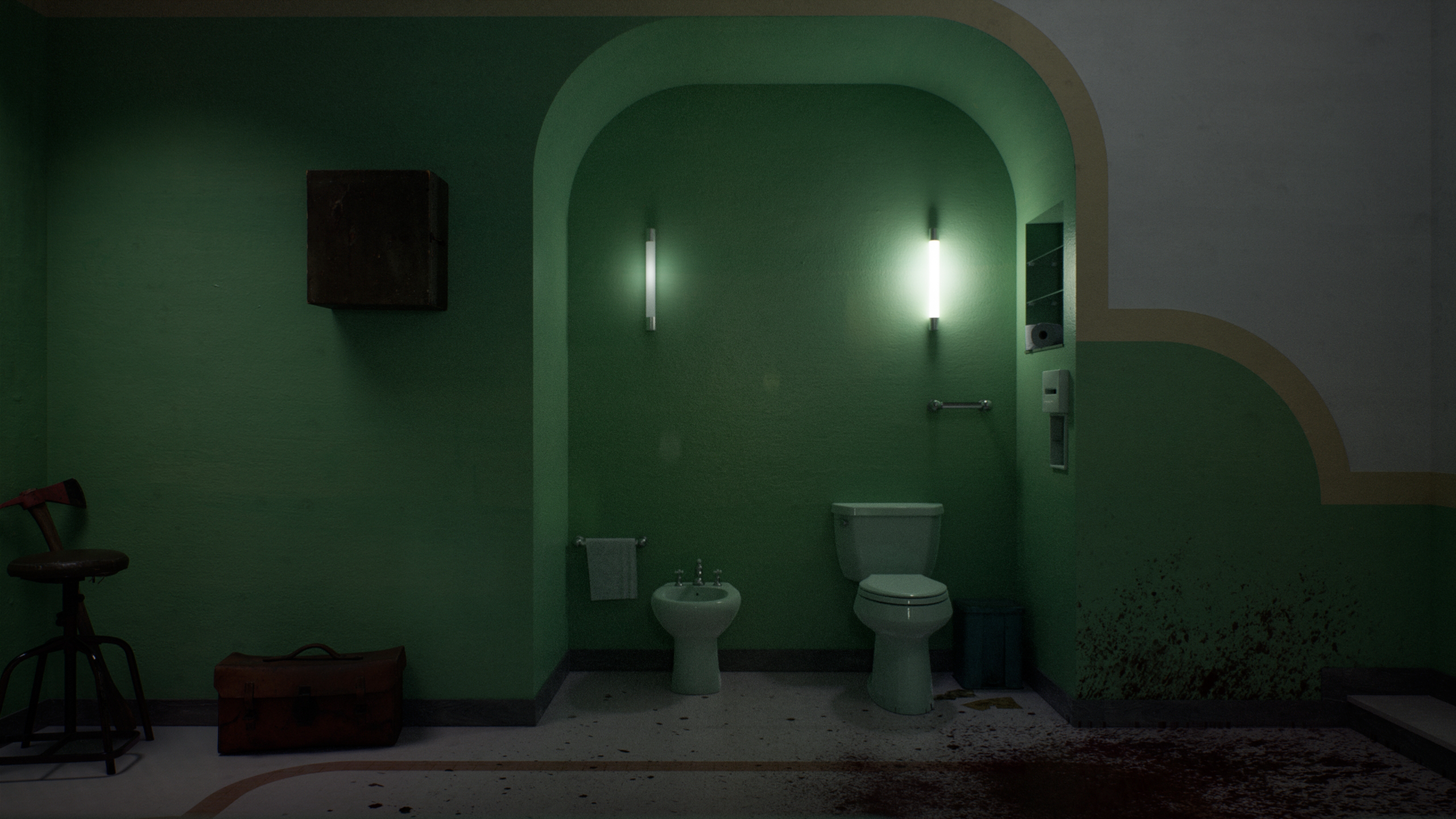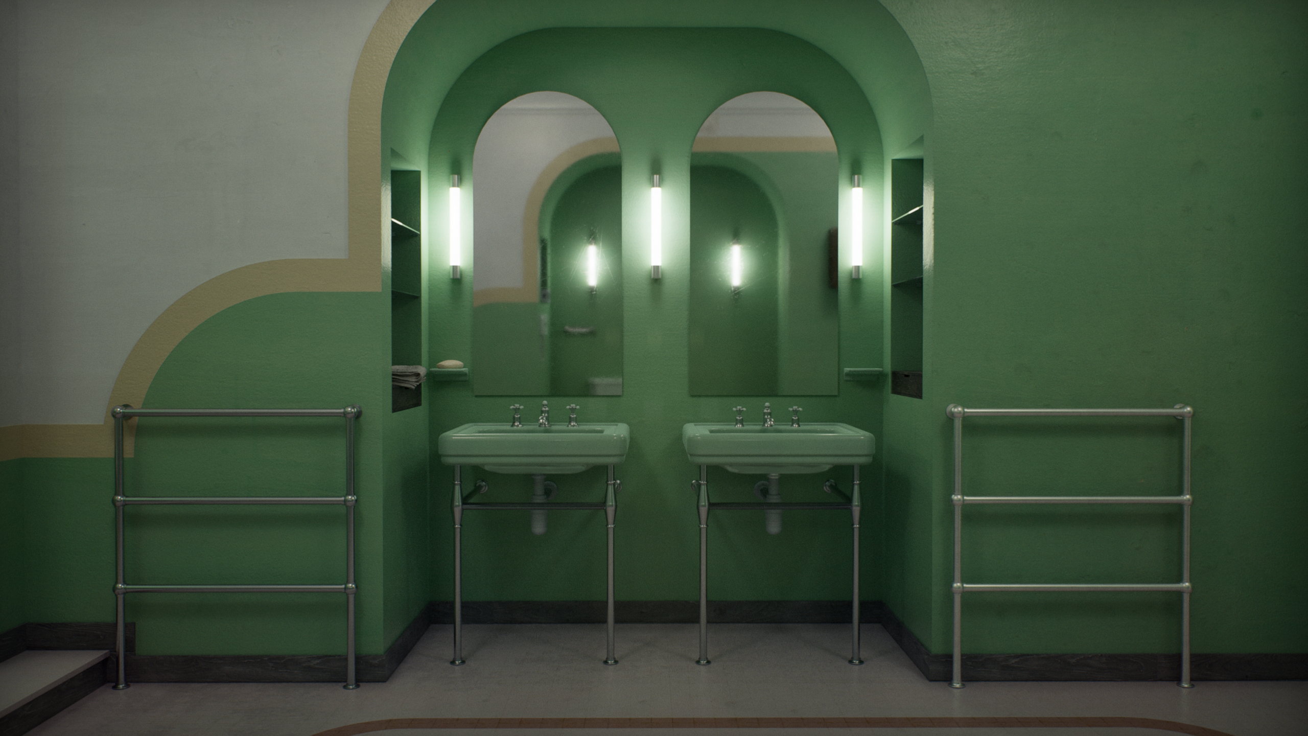 La propuesta se articula a través de un color verde saturado y una iluminación fría que baña las superficies lisas de la estancia. No hay texturas que distraigan; solo una simetría radical y una geometría perfecta que transforman un entorno cotidiano en una arquitectura de lo inquietante. Es un estudio de cómo la luz puede convertir un habitáculo impecable en un escenario cargado de tensión.