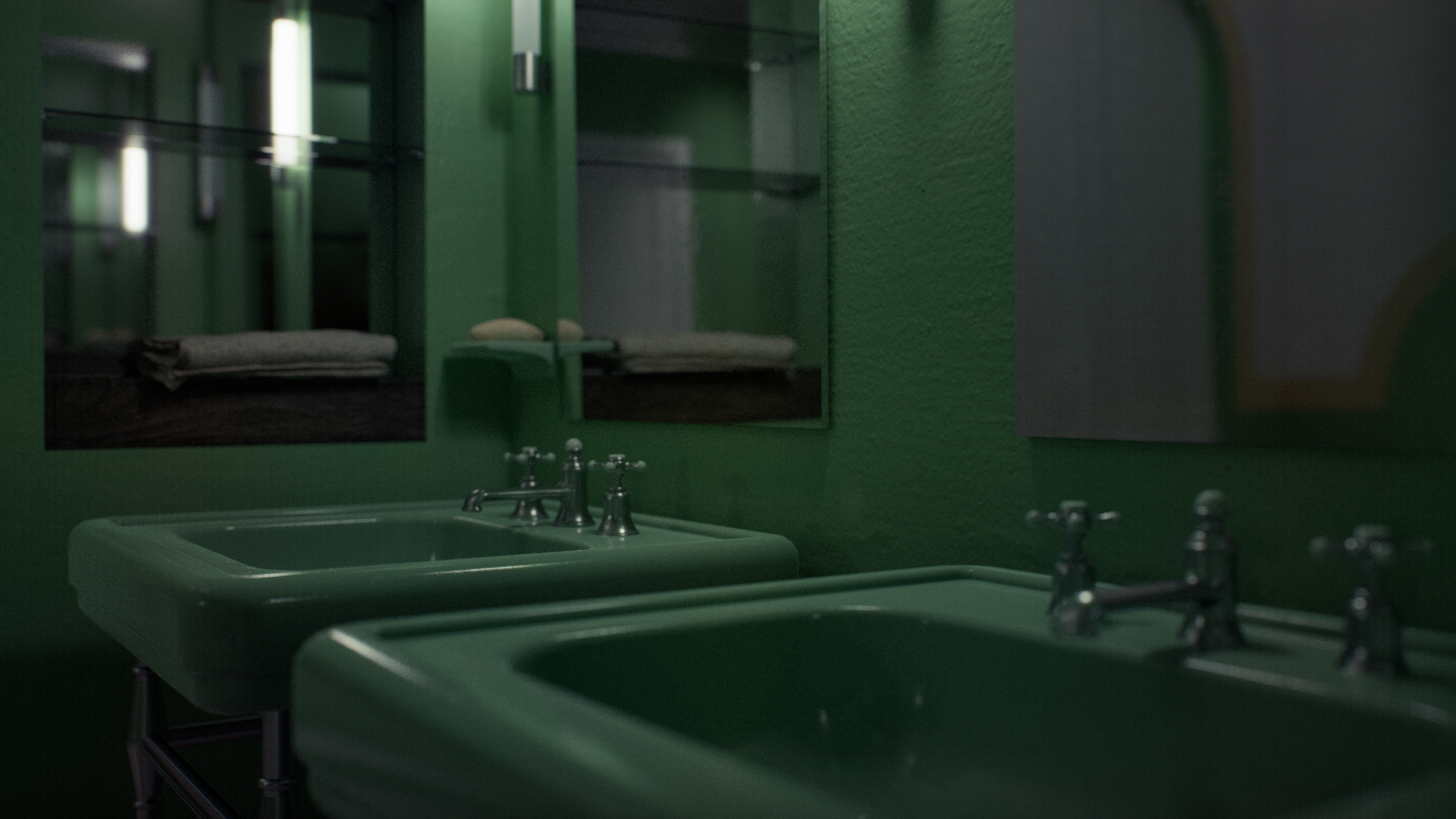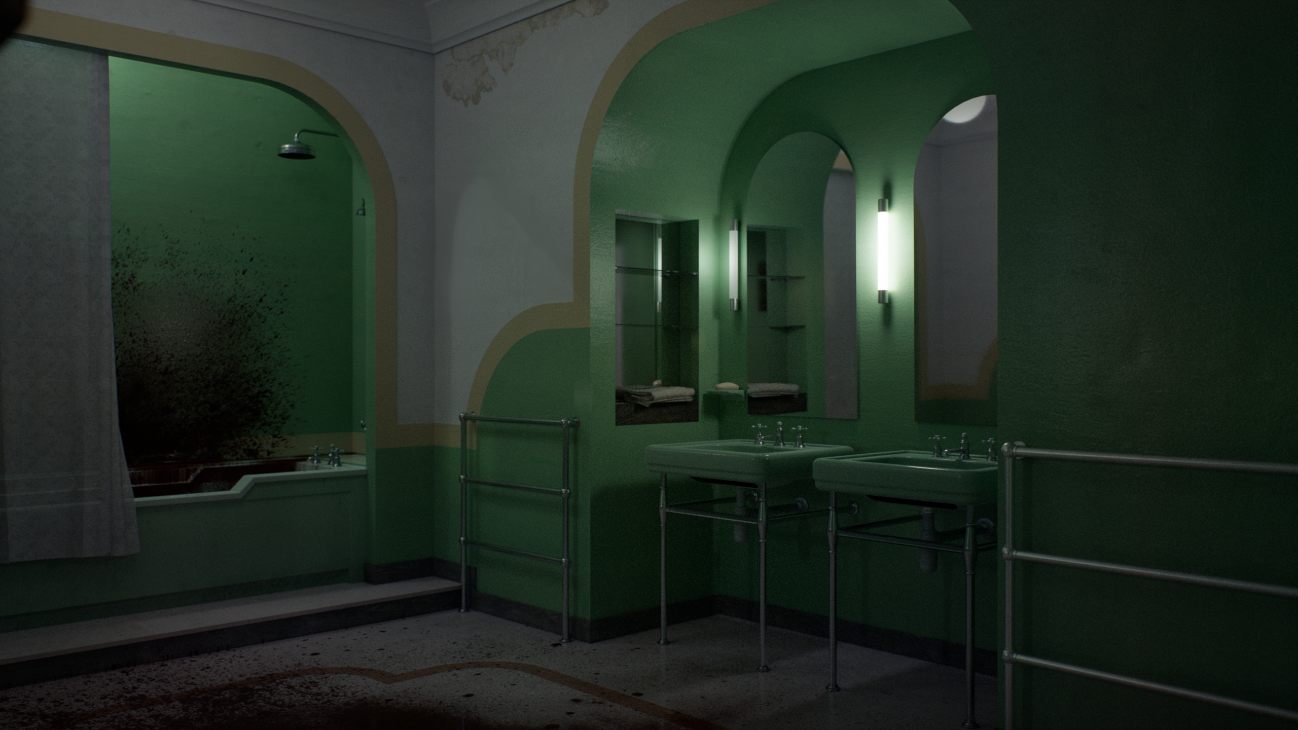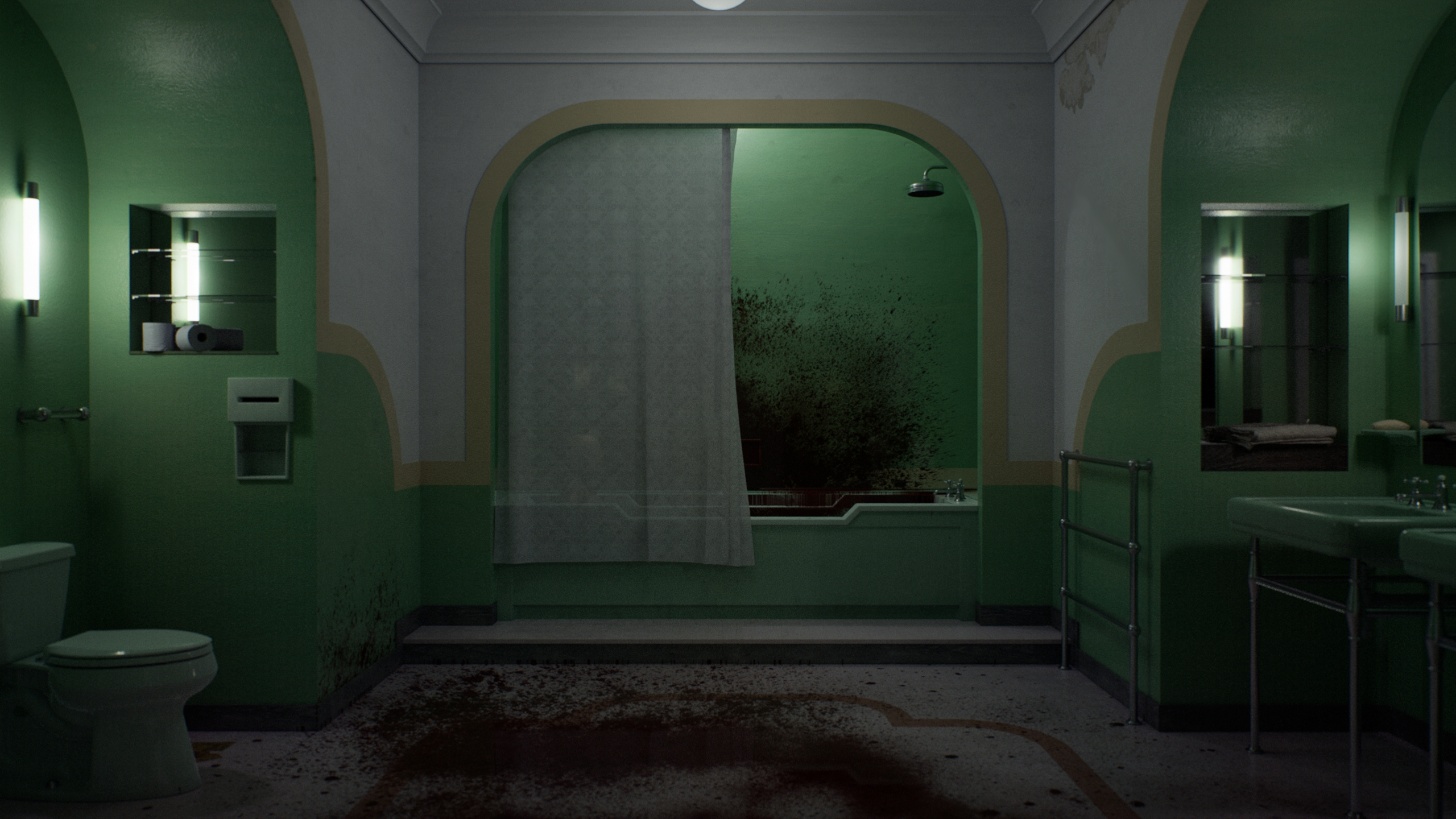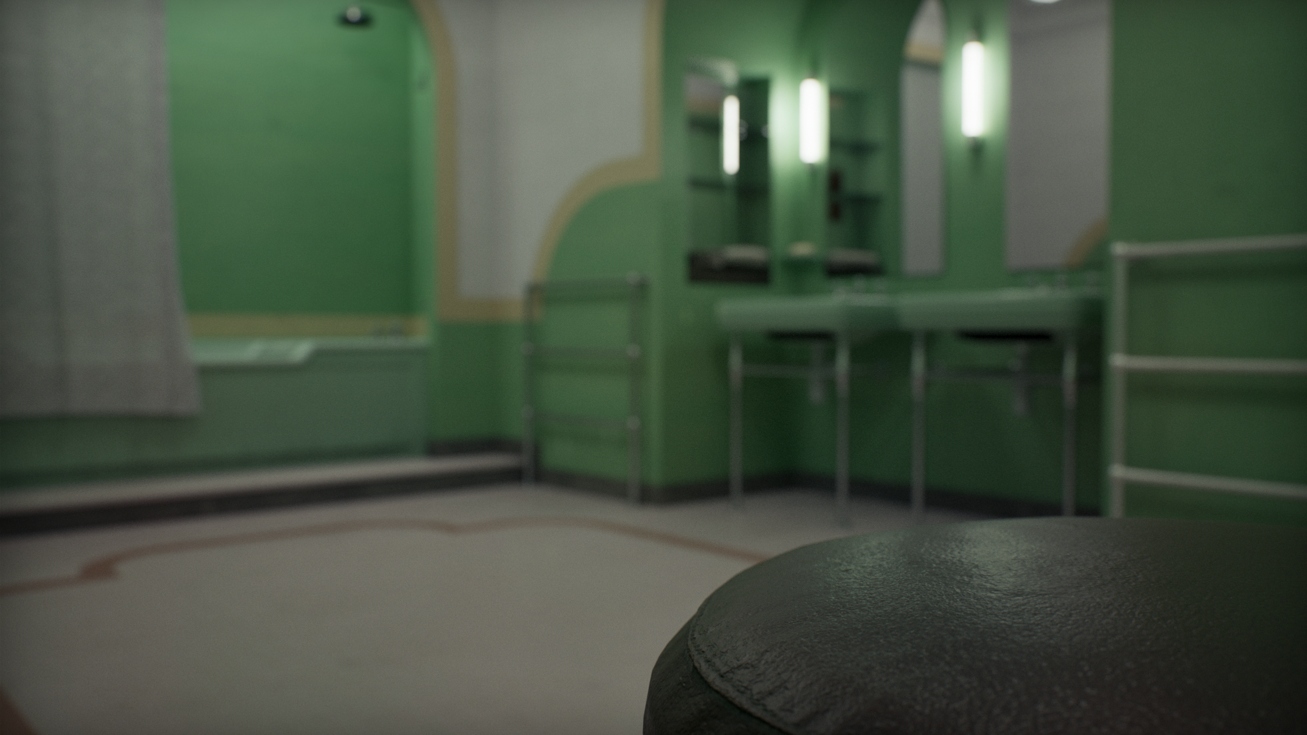 La propuesta se articula a través de un color verde saturado y una iluminación fría que baña las superficies lisas de la estancia. No hay texturas que distraigan; solo una simetría radical y una geometría perfecta que transforman un entorno cotidiano en una arquitectura de lo inquietante. Es un estudio de cómo la luz puede convertir un habitáculo impecable en un escenario cargado de tensión.
